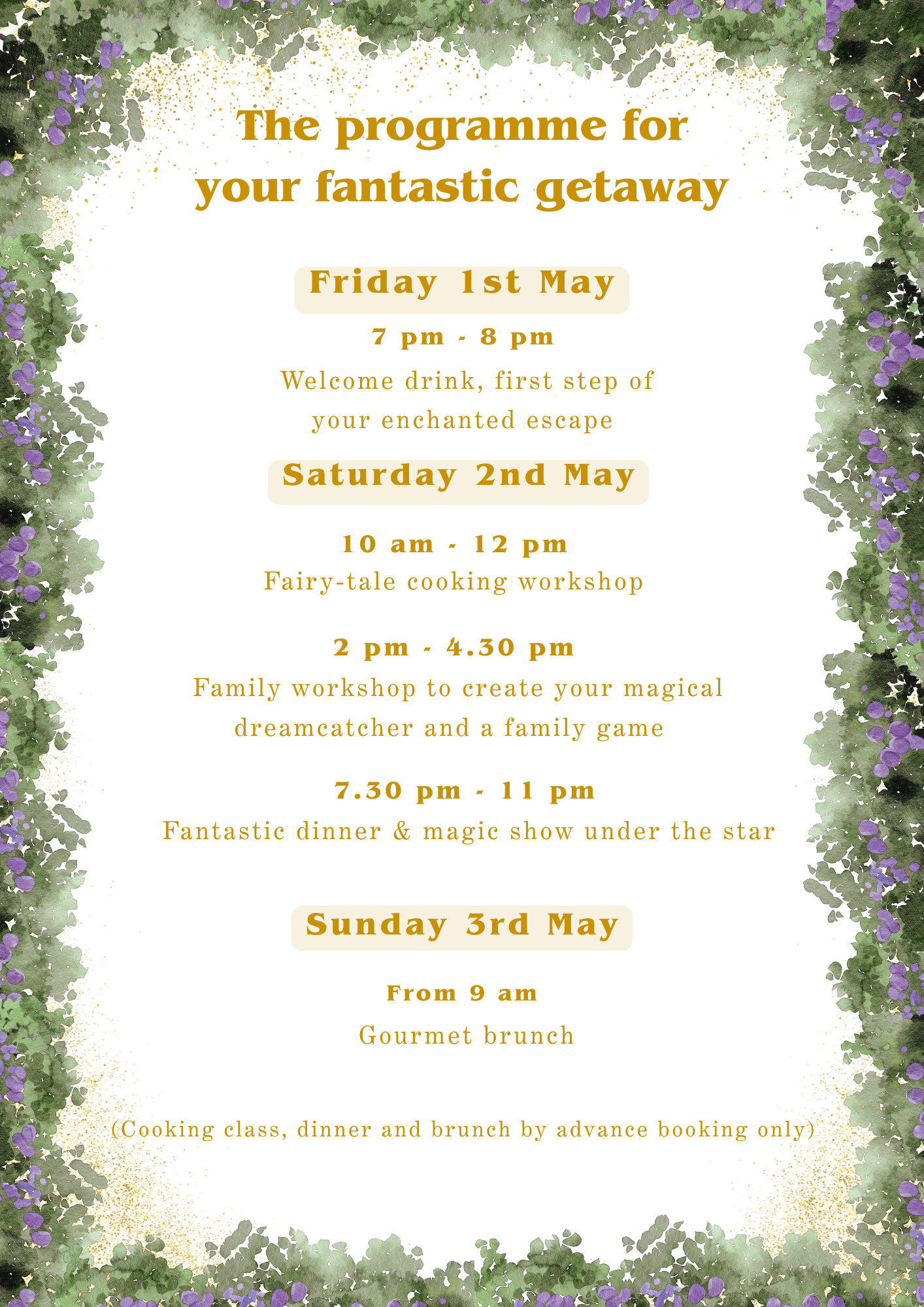 - Sunday 3rd May, an enchanted brunch brings the weekend to a gentle close.